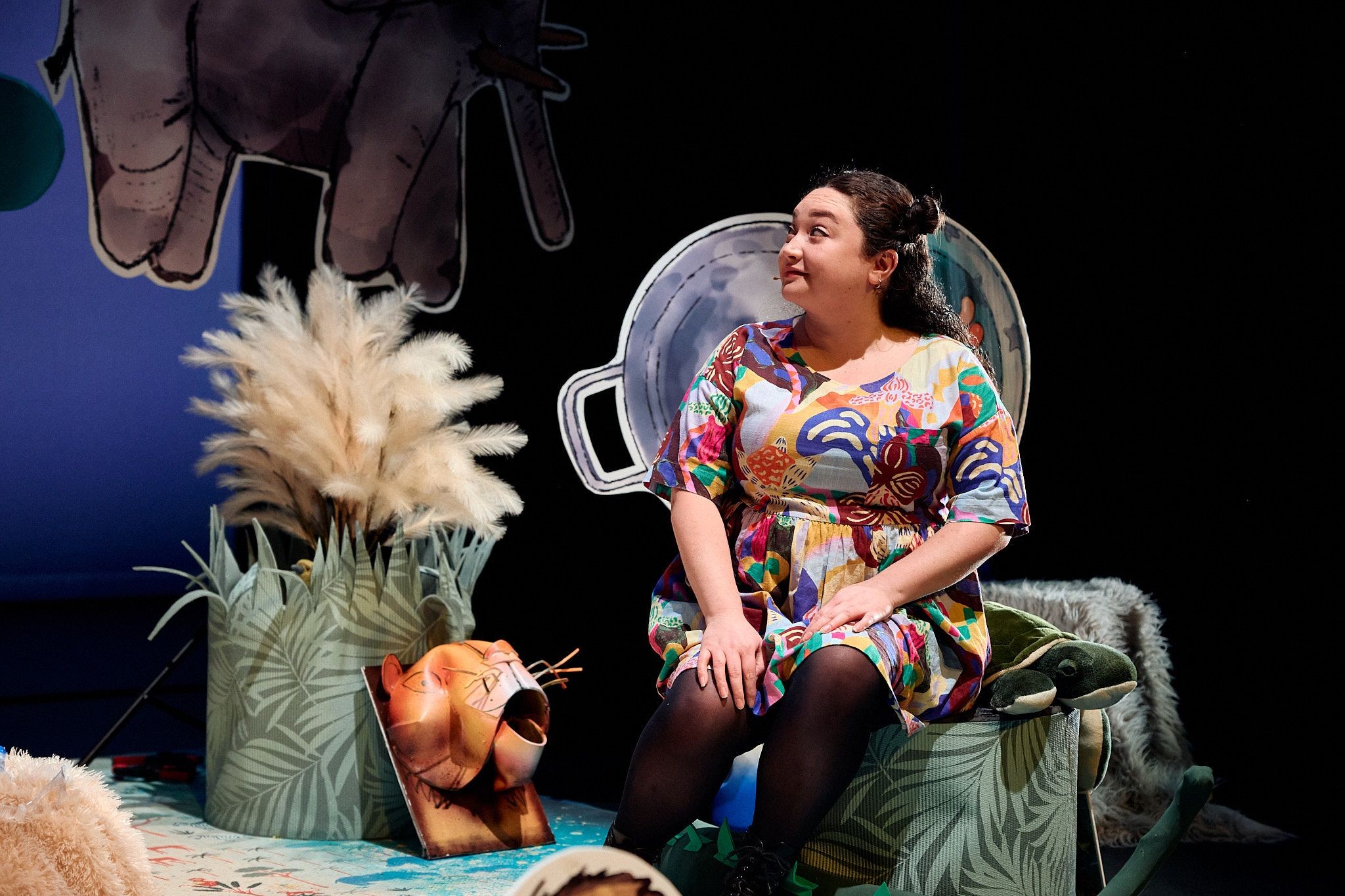 Projections work seamlessly with oversized props and puppets, including two enormous mobile phones that connect a long distance video call between a granddaughter and grandmother, enjoying a nostalgic connection through their favourite book, Imagine.